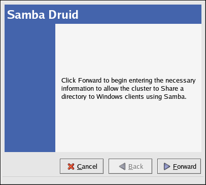 3. Start the Samba Druid by choosing Add Exports => Samba... and click Forward to continue.