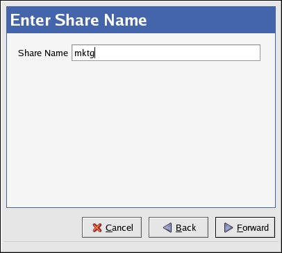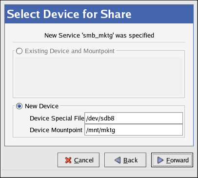 6. Enter a Share Name — Specifies the name by which clients refer to the mount point. Based on the name you specify, a corresponding /etc/samba/smb.conf.sharename file and lock directory /var/cache/samba/sharename will be created. By convention the actual Windows share name specified within the smb.conf.sharename will be set in accordance with this parameter. In practice, you can designate more than one Samba share within an individual smb.conf.sharename file. There can be at most one samba configuration specified per service, which must be specified with the first device. For example, if you have multiple disk devices (and corresponding file system mounts) within a single service, then specify a single sharename for the service. Then within the /etc/samba/smb.conf.sharename file, designate multiple individual Samba shares to share directories from the multiple devices. To disable Samba sharing of a service, the share name should be set to None.