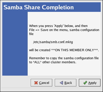 7. Click Apply to save the configurationg file (/etc/samba/smb.conf.sharename) to the cluster member.