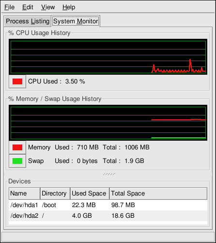 If prefer a graphical interface for free, you can use the GNOME System Monitor. To start it from the desktop, go to the Main Menu Button (on the Panel) => System Tools => System Monitor or type gnome-system-monitor at a shell prompt from within X Window System. Then choose the System Monitor tab.