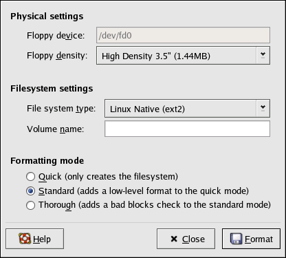 Change the settings in gfloppy to suit your needs; then click Format. A status box appears on top of the main window, showing you the status of formatting and verification. Once complete, close gfloppy and either eject or mount and use the diskette.